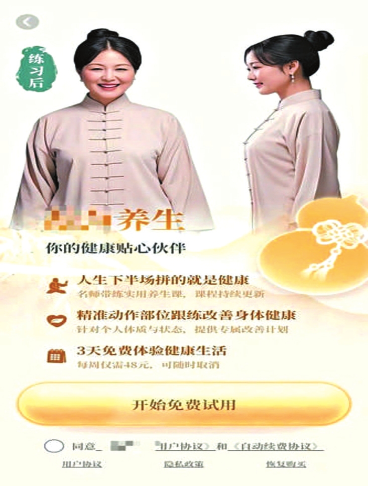 還有些App則更加離譜,下載完成后,點進(jìn)去的第一步就是要購買會員,之后才能正常使用。但在購買流程上,平臺卻耍起了花招。比如一款提供“養(yǎng)生指導(dǎo)服務(wù)”的App,頁面上會有一個大大的按鈕,寫著“開始免費試用”。但在按鈕的旁邊,卻有一行非常不起眼的小字:“每周僅需48元,可隨時取消?!倍坏┯脩酎c擊開始試用,系統(tǒng)就會跳轉(zhuǎn)到自動續(xù)費的開通界面。如果是辨別能力差的老人,可能還以為是在填寫什么注冊信息。