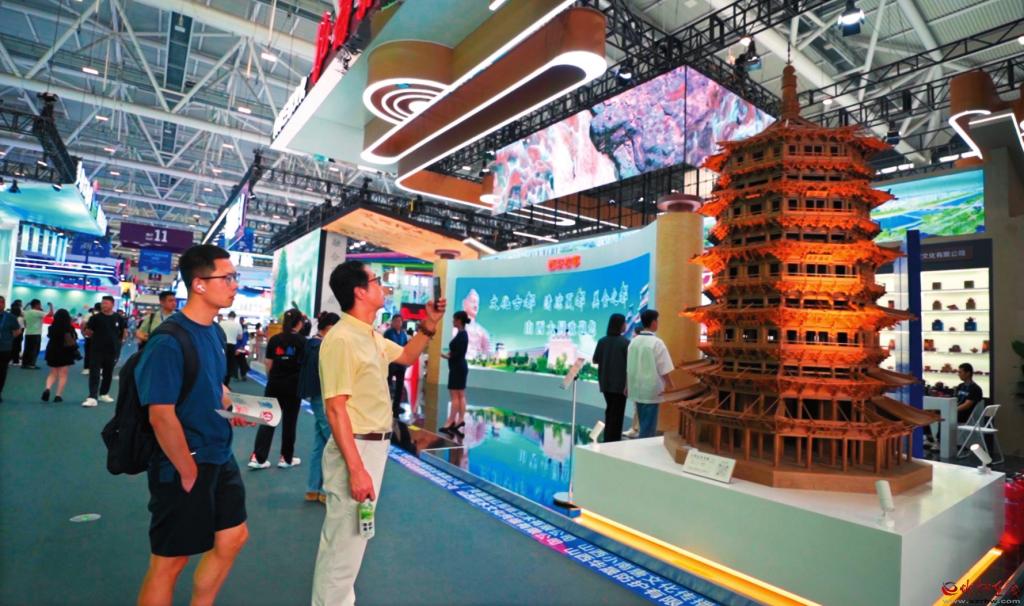 山西晟龍木雕模型藝術(shù)有限公司制作的應(yīng)縣木塔模型一亮相,便吸引了眾多觀展游客的目光。精美絕倫的造型引得人們嘖嘖稱(chēng)奇,紛紛拿出手機(jī)拍照記錄分享。該模型高約3米,最大直徑1.9米,通過(guò)20∶1的比例微縮打造,復(fù)刻了應(yīng)縣木塔的榫卯結(jié)構(gòu),其內(nèi)部樓梯扶手清晰可見(jiàn),門(mén)窗都能打開(kāi)?!拔覀兊倪@件展品,是由二十多個(gè)師傅經(jīng)過(guò)半年多的時(shí)間完成的。這次為了來(lái)深圳參展,我們專(zhuān)門(mén)把它從定襄裝運(yùn)發(fā)車(chē),用了整整兩天半的時(shí)間才送到,跨越了將近兩千公里?!痹摴究偨?jīng)理張艷峰告訴記者。