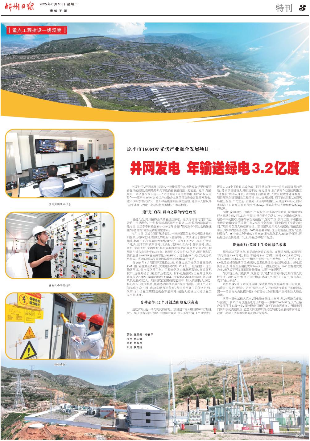 仲夏時節(jié),晉西北群山深處,一排排深藍(lán)色的光伏板如鎧甲般覆蓋著昔日的荒坡,在熾熱的陽光下流淌著靜謐而強大的能量。近日,隨著最后一條調(diào)度指令下達(dá)——“光伏電站1號主變帶電,#1SVG投入運行”——原平市160MW光伏產(chǎn)業(yè)融合發(fā)展項目宣告全容量并網(wǎng)發(fā)電。這不僅標(biāo)志著我省又一重大綠色能源項目成功落地,更以令人驚嘆的“原平速度”,為黃土高原綠色發(fā)展樹立了嶄新標(biāo)桿。