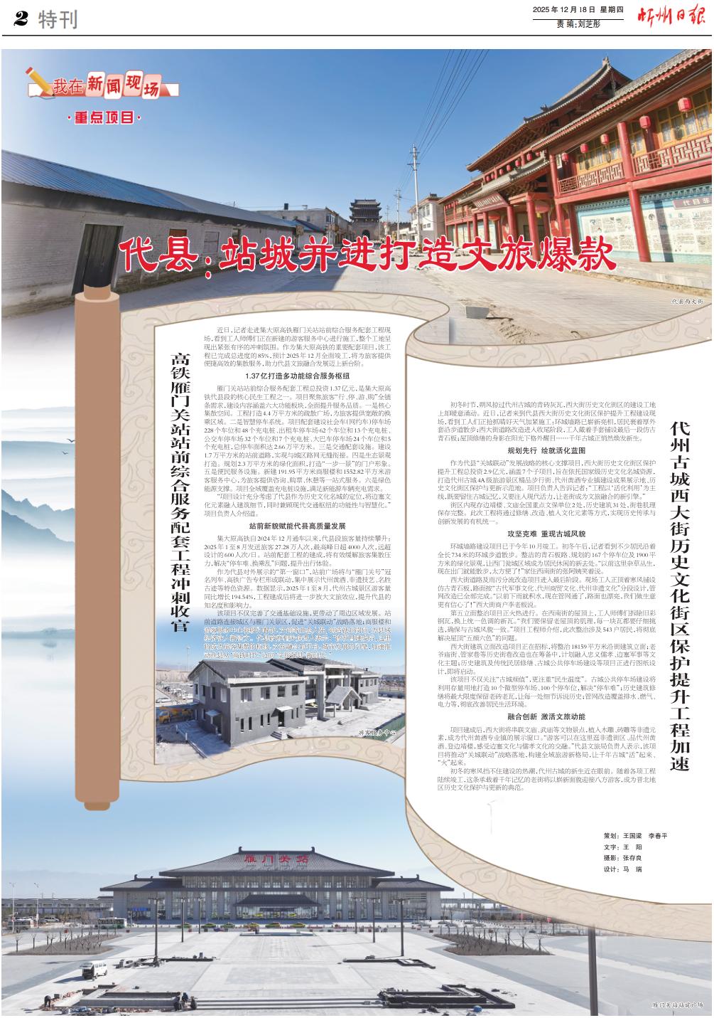 作為代縣對(duì)外展示的“第一窗口”,站前廣場(chǎng)將與“雁門(mén)關(guān)號(hào)”冠名列車(chē)、高鐵廣告專(zhuān)欄形成聯(lián)動(dòng),集中展示代州黃酒、非遺技藝、名勝古跡等特色資源。數(shù)據(jù)顯示,2025年1至8月,代州古城景區(qū)游客量同比增長(zhǎng)194.54%,工程建成后將進(jìn)一步放大文旅效應(yīng),提升代縣的知名度和影響力。