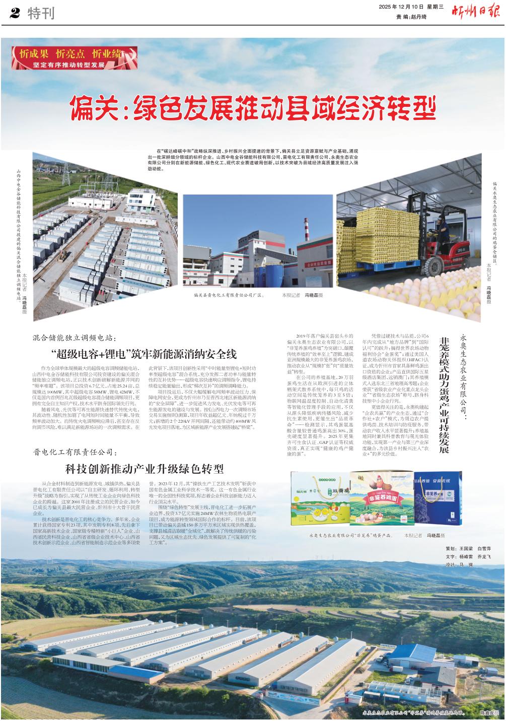 在“碳達(dá)峰碳中和”戰(zhàn)略縱深推進、鄉(xiāng)村振興全面提速的背景下,偏關(guān)縣立足資源稟賦與產(chǎn)業(yè)基礎(chǔ),涌現(xiàn)出一批深耕細(xì)分領(lǐng)域的標(biāo)桿企業(yè)。山西中電金谷儲能科技有限公司、晉電化工有限責(zé)任公司、永奧生態(tài)農(nóng)業(yè)有限公司分別在新能源儲能、綠色化工、現(xiàn)代農(nóng)業(yè)賽道破局創(chuàng)新,以技術(shù)突破為縣域經(jīng)濟高質(zhì)量發(fā)展注入強勁動能。