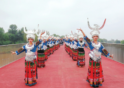 10月2日9時(shí)許,一曲高亢的苗族飛歌點(diǎn)燃了現(xiàn)場的氣氛。景區(qū)入口處,百余名來自貴州的苗族演員身著精美的傳統(tǒng)盛裝,以苗族同胞對來客最崇高敬意的“攔門酒”儀式歡迎八方來客。銀飾閃爍,鼓聲激昂,歡快的踩鼓舞、互動十足的竹竿舞等接連上演,令人目不暇接。
