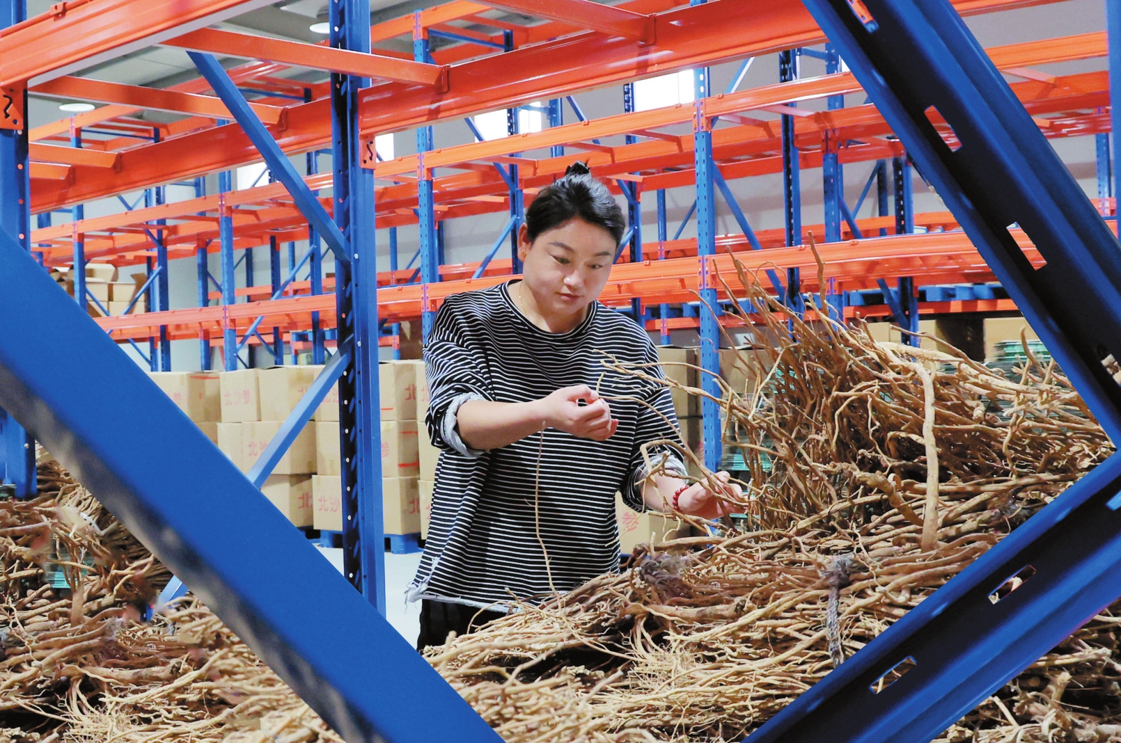 恒宇天然草本資源有限公司黃芪藥材倉庫工作人員正在檢查黃芪的保存情況。本報記者范琛攝