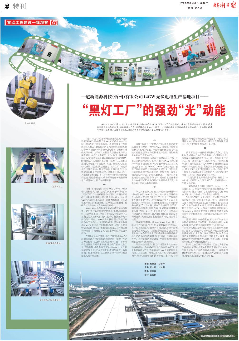 6月24日,步入位于忻州經(jīng)濟(jì)開發(fā)區(qū)的一道新能源科技(忻州)有限公司14GW光伏電池生產(chǎn)車間,強(qiáng)烈的現(xiàn)代感撲面而來。沒有傳統(tǒng)工廠的喧囂與人頭攢動,取而代之的是精密的機(jī)械韻律:數(shù)百臺AGV智能小車(自動導(dǎo)引運(yùn)輸車)沿著預(yù)設(shè)路線無聲穿梭;上千臺六軸機(jī)器人手臂在生產(chǎn)線上精準(zhǔn)舞動,完成硅片的抓取、定位、加工;高精度的在線AOI(自動光學(xué)檢測)設(shè)備如同敏銳的“眼睛”,瞬間完成產(chǎn)品瑕疵篩查。整個(gè)流程中,從原料開盒到高效電池片下線包裝,實(shí)現(xiàn)了全程無人化、自動化操作。這里,就是被譽(yù)為“黑燈工廠”的現(xiàn)代化光伏制造基地。即使在夜間無照明條件下,也能依靠智能系統(tǒng)高效運(yùn)轉(zhuǎn)。這座總投資60億元、占地474畝的超級工廠,歷經(jīng)兩年多時(shí)間緊鑼密鼓的建設(shè),現(xiàn)已全面投產(chǎn),成為忻州這座傳統(tǒng)能源城市向新質(zhì)生產(chǎn)力躍升的耀眼地標(biāo)。