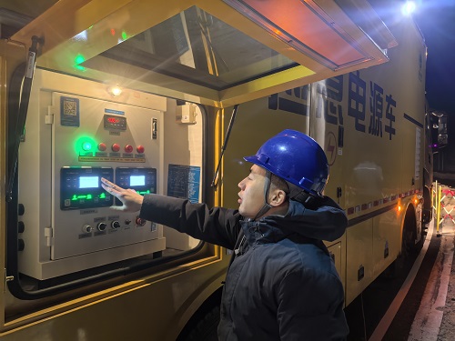 夜色徹底吞沒山巒,氣溫驟降至零下,遠(yuǎn)處山影只剩模糊輪廓。保電隊員們裹緊工裝,在寒風(fēng)里反復(fù)校驗接線端子。23時40分,隨著合閘指令下達(dá),第一輛中壓發(fā)電車正式啟動,低沉的轟鳴在山谷間回蕩,穩(wěn)定電流順利注入線路。來不及片刻休整,隊員們又馬不停蹄地奔赴下一個點位。