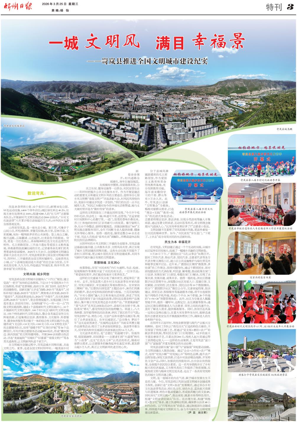 山西省岢嵐縣,是一座生態(tài)小城。夏日里,可漫步于山間小徑,聽(tīng)松濤陣陣、賞繁花似錦;秋日里,層林盡染、五彩斑斕,宛如一幅絢麗多彩的山水畫(huà)卷。登上高山之巔,極目遠(yuǎn)眺,云海翻涌、山巒起伏,壯美景色盡收眼底。岢嵐,更是一方紅色熱土,革命精神和紅色文化在這里代代相傳。毛主席路居館、三井戰(zhàn)斗遺址等愛(ài)國(guó)主義教育基地,承載著那段波瀾壯闊的歷史,記錄著革命先輩們的英勇事跡和崇高精神。2025年5月23日,全國(guó)精神文明建設(shè)表彰大會(huì)在北京召開(kāi),岢嵐縣榮獲第七屆全國(guó)文明城市稱(chēng)號(hào),陽(yáng)坪村、三井鎮(zhèn)榮獲全國(guó)文明村鎮(zhèn)稱(chēng)號(hào)。這座晉西北小城,以“小縣城也能創(chuàng)造大奇跡”的信念?yuàn)^力攻堅(jiān),五年來(lái)攻堅(jiān)克難、久久為功,終繪就出“環(huán)境優(yōu)美、秩序井然、和諧幸福”的文明答卷。