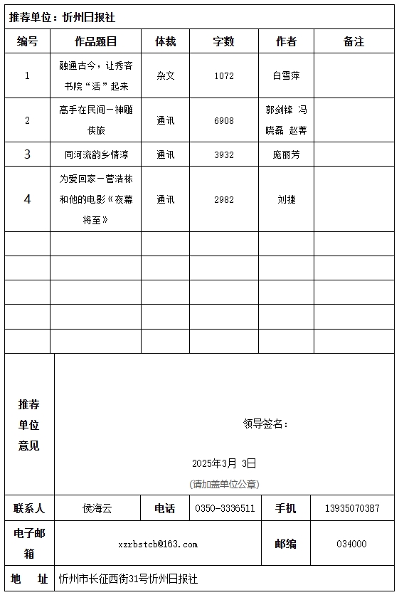 經(jīng)忻州日?qǐng)?bào)社編委會(huì)研究決定,以下作品擬推薦申評(píng)第34屆山西新聞獎(jiǎng),現(xiàn)予以公示。有反對(duì)意見(jiàn)者,請(qǐng)將反對(duì)意見(jiàn)書(shū)面報(bào)至統(tǒng)計(jì)考核部。
