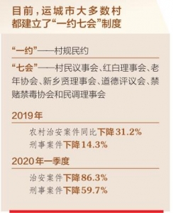 目前,運城市大多數(shù)村都建立了“一約七會”制度——“一約”是村規(guī)民約,“七會”是村民議事會、紅白理事會、老年協(xié)會、新鄉(xiāng)賢理事會、道德評議會、禁賭禁毒協(xié)會和民調(diào)理事會。這“一約七會”制度的不斷健全,對破除鄉(xiāng)村社會陋習(xí)、引導(dǎo)群眾移風(fēng)易俗、引領(lǐng)社會新風(fēng)、化解矛盾糾紛,維護基層社會和諧穩(wěn)定起到了重要作用。村民的正能量多了,鄉(xiāng)村的負面事情少了,社會治安狀況得到明顯改善,群眾安全感顯著增強。2019年運城市農(nóng)村治安案件同比下降31.2%,刑事案件下降14.3%;2020年一季度,治安案件下降86.3%,刑事案件下降59.7%。