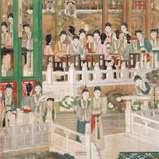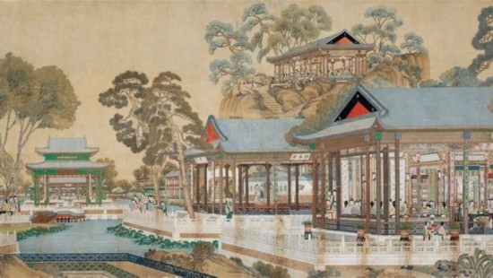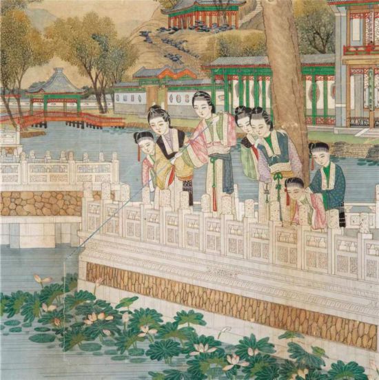 畫面中,曲折縈紆的溪水自蘅蕪院流經(jīng)牡丹亭、凹晶館、蓼風(fēng)軒、秋爽齋等地,最終蜿蜒向畫面遠(yuǎn)方,層層亭臺廊橋,一望無盡。許軍杰認(rèn)為,此繪之溪水應(yīng)為沁芳溪。正如周汝昌先生在《北京大觀園·引言》中評價:“大觀園全部的主脈與‘靈魂’是一條蜿若游龍的‘沁芳溪’。亭、橋、泉、閘,皆以此二字為名,可為明證。一切景觀,依溪為境”,“大觀園的一切池、臺、館、泉、石、林、塘,皆以沁芳溪為大脈絡(luò)而盤旋布置?!眻D中的這曲溪水亦有異曲同工之功能,將兩岸建筑、山石、樹木巧妙地聯(lián)系在一起,使其形成一個有機的園林整體。(李君娜)