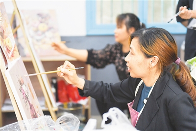 近年來(lái),湖南省瀏陽(yáng)市小河鄉(xiāng)引進(jìn)農(nóng)民畫(huà)室產(chǎn)業(yè),讓農(nóng)民可以在家務(wù)農(nóng)時(shí)利用空余時(shí)間務(wù)工。小河鄉(xiāng)現(xiàn)有460余名農(nóng)民畫(huà)師,累計(jì)帶動(dòng)50余名貧困戶(hù)參與。圖為小河鄉(xiāng)烏石村村民在繪制油畫(huà)。