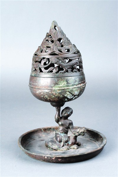 西漢鎏銀騎獸人物博山爐,河北博物館藏。1968年,河北滿城陵山二號(hào)漢墓發(fā)掘出土。在西漢,人們喜愛焚香熏煙,來驅(qū)瘟防疫,養(yǎng)生祛病。
