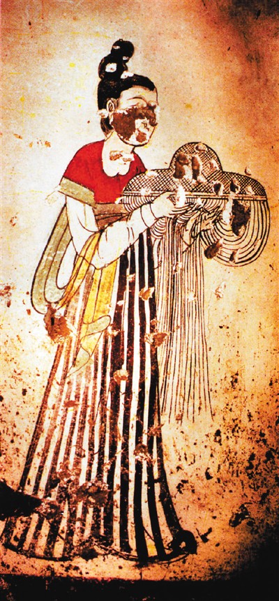 唐燕妃墓捧帷帽侍女壁畫,昭陵博物館藏。1990年,唐太宗的妃子燕氏的墓室被清理出來,墓室壁畫中,宮女手中所捧的帷帽垂掛著一圈長絲穗,形成一道薄幕,有一定衛(wèi)生防護(hù)功能。