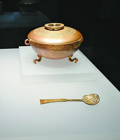 湖北曾侯乙墓出土的金盞和金漏匕(食器)本報(bào)記者 李韻攝/光明圖片