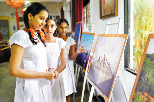 9月29日,在斯里蘭卡首都科倫坡的總統(tǒng)女子學(xué)校小禮堂,學(xué)生們觀看展出的中國四川風(fēng)光攝影作品。新華社記者 唐 璐 攝