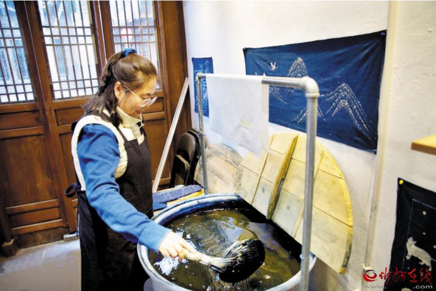 “染缸是我最寶貝的東西。我對它就像對待孩子,不能冷著、熱著、累著、餓著。”趙慧說,天然染料的缸需要“養(yǎng)”,冬天冷了烤暖氣,夏天熱了吹空調(diào),還要不時(shí)添加?xùn)|西,“這個(gè)缸我‘養(yǎng)’了四年多,叫它‘藍(lán)寶寶’。”