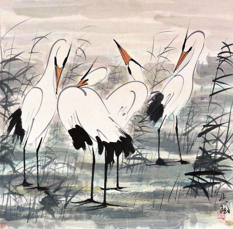 到了近現(xiàn)代,傳統(tǒng)文藝思想開始發(fā)生轉(zhuǎn)變,呂澂、康有為等人在繪畫領(lǐng)域提出改良思想,鶴主題的繪畫也有所變化。在林風(fēng)眠創(chuàng)作的《群鶴圖》《雙鶴圖》《白鶴》等作品中,既可以看到中國畫白描的影子,又可以感受到西方速寫技法的影響?!度胡Q圖》由幾只立于廣袤水草的白鶴構(gòu)成,它們姿態(tài)各不相同。與鶴之閑適姿態(tài)相對應(yīng)的是隨風(fēng)浮動(dòng)的蘆葦,它們在微風(fēng)吹拂下雖形態(tài)萬千,但并不雜亂,在總體偏暗的色調(diào)中顯出和諧之味。《雙鶴圖》表現(xiàn)了鶴的輕盈姿態(tài),兩只鶴步伐保持一致,展示出閑適自得之感。林風(fēng)眠筆下的鶴,顯然沒有古代繪畫中仙風(fēng)道骨、富貴長壽之意,與寫意之鶴相比,其作品里的鶴與自然萬物融為一體,表達(dá)出強(qiáng)有力的現(xiàn)代語言。
