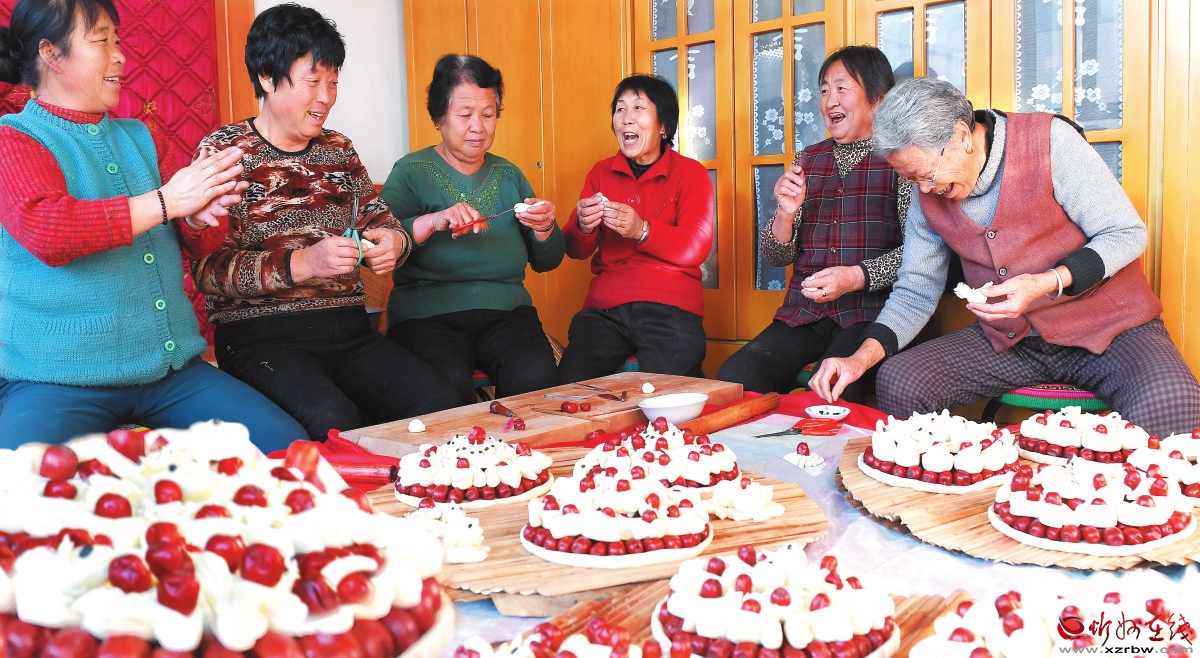 “臘八節(jié)”拉開了過(guò)年的序幕,臘月二十三,又稱“小年”。臨近年根,置辦年貨、洗洗涮涮,人們掃家除塵盡可能提早在臘月二十三前完成。為了飽享年節(jié)的輕松美好,在忻州民間有正月里不蒸灶的說(shuō)法,人們要將年后一整個(gè)正月內(nèi)的所有主食集中在臘月加工制熟。過(guò)去,由于忻州小麥種植有限,唯獨(dú)過(guò)年才有口福享受幾頓白面食品,所以面食蒸灶是一件必不可少的事情。饃饃、花糕、棗山、錢龍,有女兒的還要有毛籃兒。上午蒸灶,下午搟豆面,這似乎也成為一種慣例。捏過(guò)花糕棗山的大面案依然還在炕邊擺著,把豆面和成硬硬的,搟得薄如紙張,折成幾折,切成一指寬左右的寬條,這是專為大年初一中午準(zhǔn)備的“寬心面”。