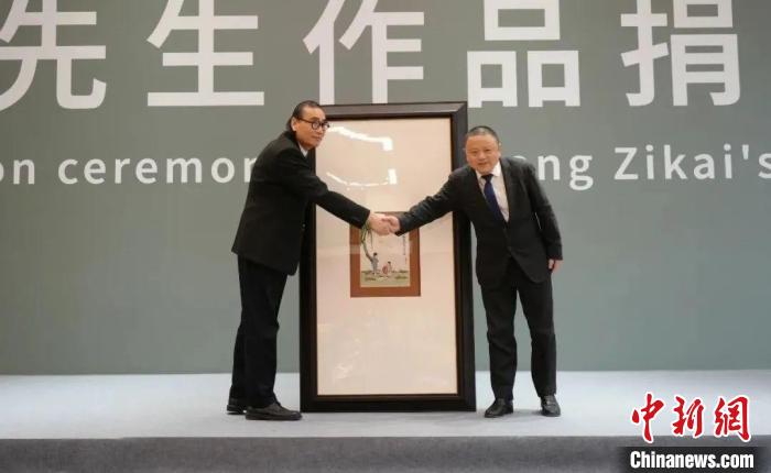中國(guó)國(guó)家畫(huà)院院長(zhǎng)劉萬(wàn)鳴(左)接受豐子愷家屬捐贈(zèng)的豐子愷國(guó)畫(huà)作品。 中國(guó)國(guó)家畫(huà)院供圖