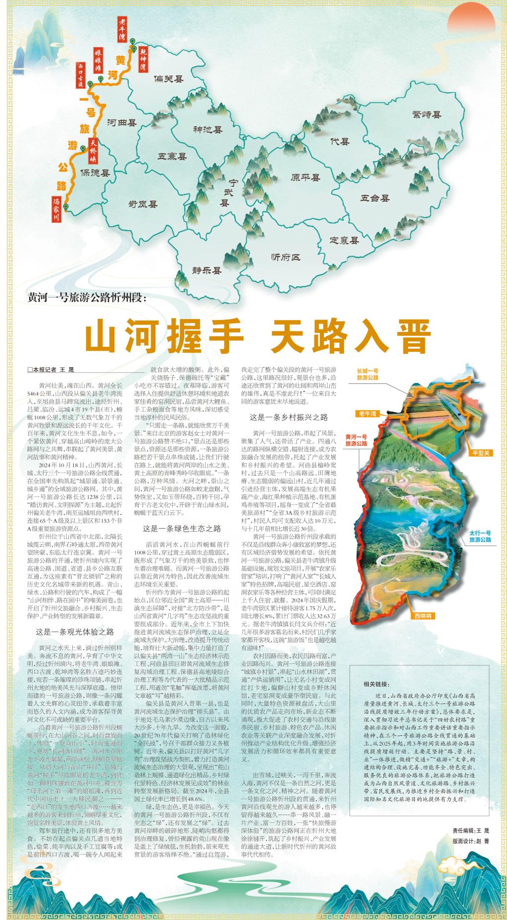 2024年10月18日,山西黃河、長城、太行三個一號旅游公路全線貫通,在全國率先構(gòu)筑起“城景通、景景通、城鄉(xiāng)通”的全域旅游公路網(wǎng)。其中,黃河一號旅游公路長達1238公里,以“踏訪黃河、文明探源”為主題,北起忻州偏關(guān)老牛灣,南至運城垣曲西哄村,連接65個A級及以上景區(qū)和153個非A級重要旅游資源點。