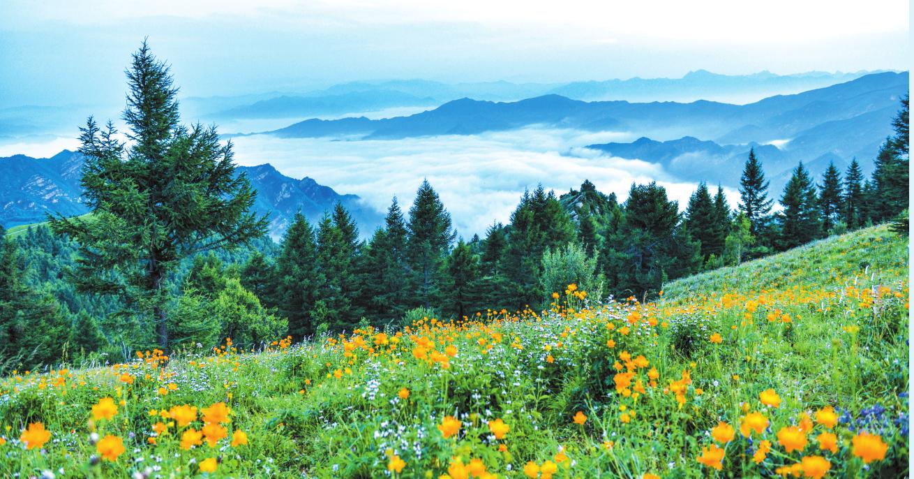 駝梁地形四周封閉,中為谷地,形成了山巒綿亙、溝壑縱橫、河川橫跨東西的自然生態(tài)景觀。其主峰海拔2281米,為“晉冀兩省四縣”交匯處,駝峰山巒蜿蜒,此起彼伏,猶如“靜臥巨駝”而取名駝梁。與五臺山風(fēng)景名勝區(qū)東北相望,遙相呼應(yīng),有其獨(dú)特和不可替代之優(yōu)勢,同為五臺山旅游資源亮點(diǎn)。由山谷到山頂分布著落葉林混交林帶、樺樹林帶、落葉松林帶,生物垂直分布變化明顯。駝梁頂部,有一片亞高山草甸,約近萬畝的茵茵綠草,像碩大無比的地毯,與天際交接,一望無垠。隱于藍(lán)天白云和松林綠波之間,散落著漫山遍野的杜鵑花、金蓮花、百合花、燈籠花等,置身其間,如進(jìn)花海,恍若仙境。因位于云霧縹緲的高山之巔,故被人譽(yù)為“云頂花海”。