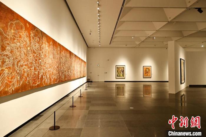 展廳現(xiàn)場展示18余米長的巨幅布面重彩作品《伏媧紋銘圖》。 主辦方供圖