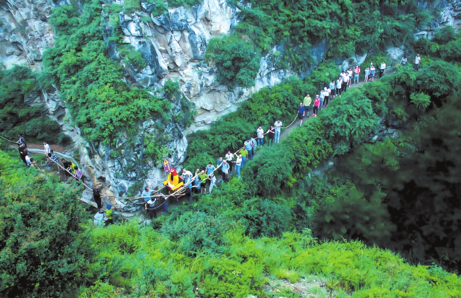 上山的路越來越難走,也越來越危險。前方是峭壁,只容一人通過,腳下便是萬丈深淵,一旦失足,后果難料。女士們有點(diǎn)害怕。朱部長一邊鼓勵,一邊教她們要領(lǐng):踩實、抓穩(wěn)、不要向下看。前面幾位戰(zhàn)戰(zhàn)兢兢相繼通過,最后一位女士微胖,滿臉汗珠,雙腿打顫,人們都為她捏了一把汗,好在有驚無險。