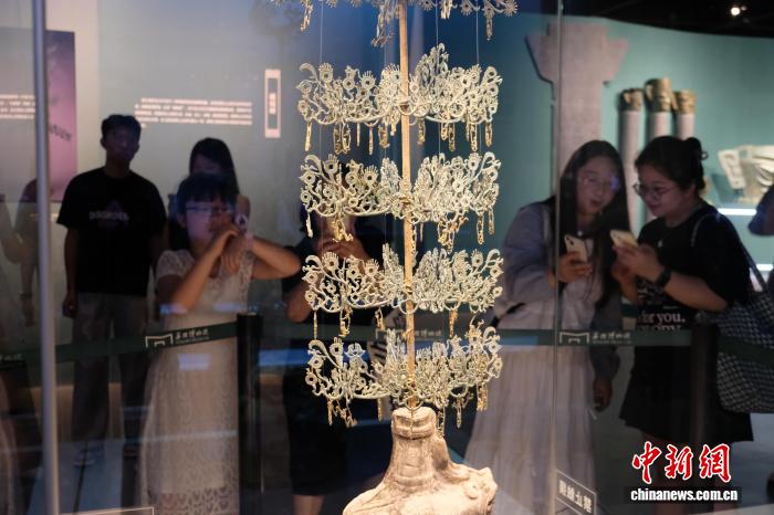 8月2日,游客在浙江寧波觀(guān)看三臺(tái)縣博物館藏“馬猴搖錢(qián)樹(shù)樹(shù)身”。 林波 攝