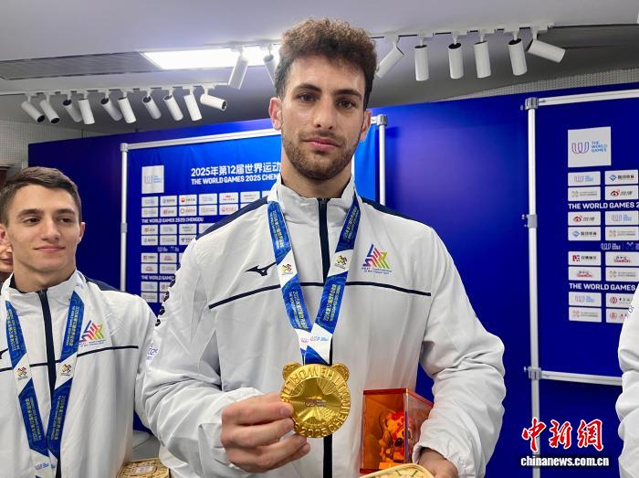 8月10日晚,成都世運會期間,以色列蹦床運動員羅特姆·阿米海(Rotem Amihai)展示獎牌,該獎牌綬帶采用蜀繡工藝。王利文 攝