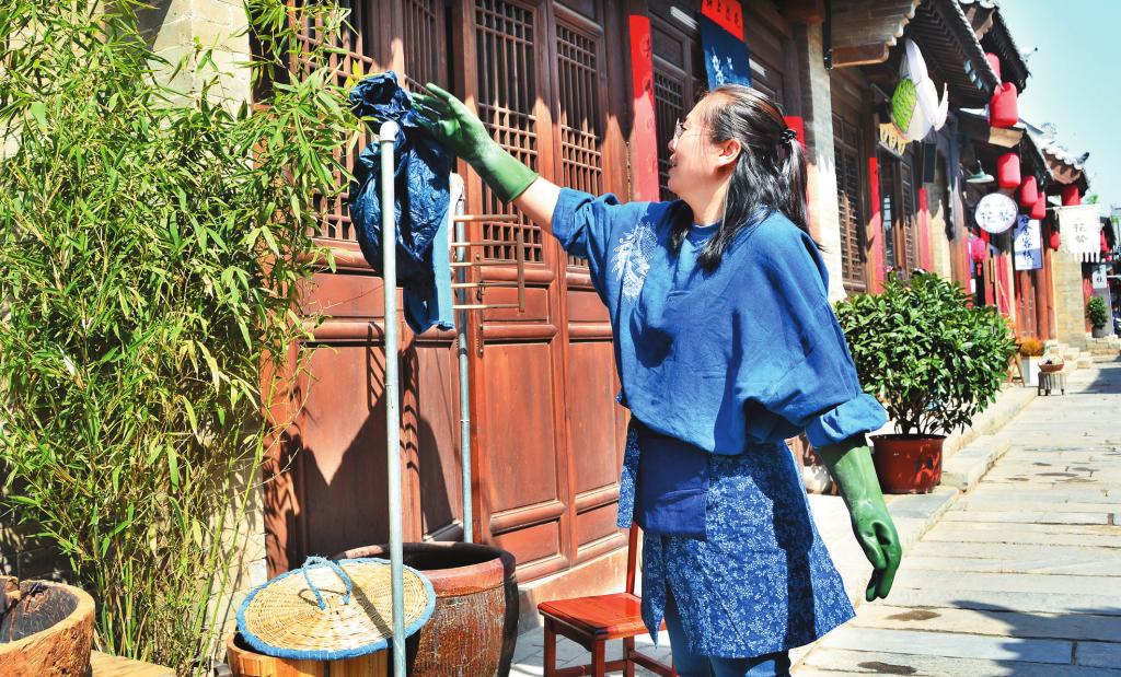 趙慧說(shuō),古城文創(chuàng)街的店鋪給了手工藝人更多的可能性和幸福感。以前大多是因?yàn)闊釔郏约核奶幷伊巳静淖鲋?,身邊的朋友們口口相傳,遇見喜歡的就收走,現(xiàn)在有了古城的平臺(tái),更多的人認(rèn)識(shí)了草木染,更多喜歡傳統(tǒng)文化、講究生活品質(zhì)的朋友們愛上了這樣的作品。趙慧守著小店,染染布、縫縫包、種種花、喝喝茶,把自己的熱愛和鉆研一顏一色染進(jìn)布里,一針一線縫到作品中。通過那些有趣和有創(chuàng)意的作品,她覺得生活更加溫馨了。