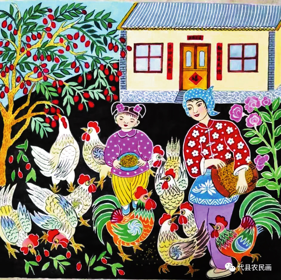 她們的作品,取材于農(nóng)村、農(nóng)業(yè)、農(nóng)民生活,或表現(xiàn)美好的生活場(chǎng)景,或反映豐收的喜悅,或體現(xiàn)鄉(xiāng)愁,在表現(xiàn)手法上采用大膽的夸張、變形,巧用艷麗的色彩,人物刻畫細(xì)致入微,內(nèi)心喜悅躍然紙上,富有鮮明的地方特色。綜觀她們的作品,無不展現(xiàn)了社會(huì)主義新農(nóng)村在新時(shí)代的新變化、新風(fēng)貌,在傳承和弘揚(yáng)代縣文化、引領(lǐng)社會(huì)主義精神文明建設(shè)方面做出了出色的嘗試與實(shí)踐。