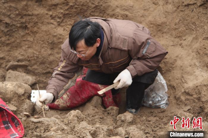 2012年1月16日,何利群在鄴城遺址東郭區(qū)佛教造像埋藏坑遺跡進(jìn)行現(xiàn)場發(fā)掘。 (鄴城考古隊(duì)供圖)