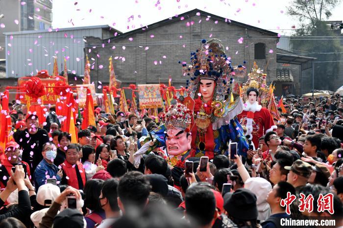 中新網(wǎng)福州2月19日電 (葉秋云)“咚咚咚……”19日上午,一陣陣鑼鼓聲從僑鄉(xiāng)福建省福州市長樂區(qū)潭頭鎮(zhèn)厚福村傳出,一場傳統(tǒng)游神民俗活動在此舉行,來自海內(nèi)外的游客紛紛舉起手機(jī)和相機(jī)拍照留影。