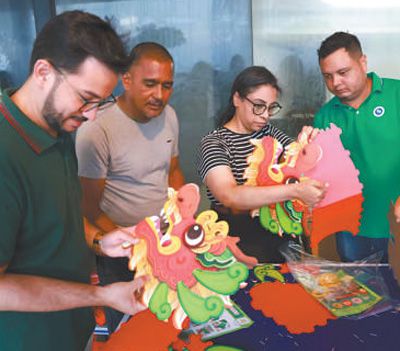2月3日,巴西民眾在累西腓春節(jié)廟會(huì)活動(dòng)現(xiàn)場(chǎng)體驗(yàn)制作手工龍頭。本報(bào)記者 陳海琪攝