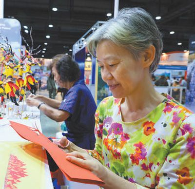 1月25日,在泰國(guó)國(guó)際旅游展上,參觀者體驗(yàn)中國(guó)剪紙。本報(bào)記者 白元琪攝