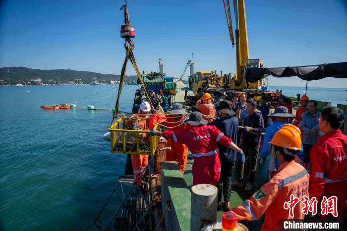 資料圖:考古人員在現(xiàn)場(chǎng)起吊彈藥箱。山東省水下考古研究中心供圖