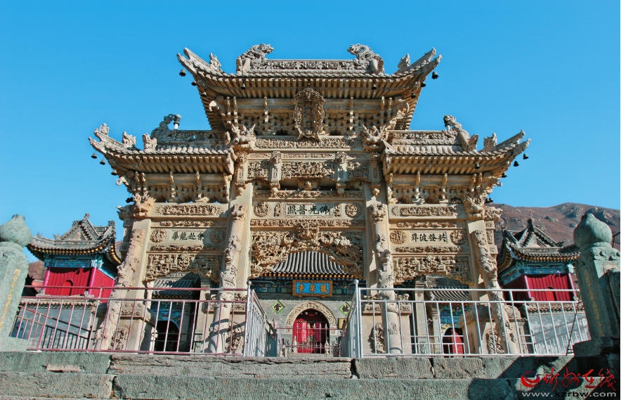 寺中的影壁、牌坊、墓塔是三件藝術(shù)瑰寶。影壁和牌坊與東院處在一條中軸線上,由108級石板臺階相連。臺階底部的照壁,正中所嵌一組漢白玉石雕,可以看作五臺山風(fēng)景名勝區(qū)主要寺廟的微縮示意圖。而臺階上面的三門四柱牌坊更為精致壯觀,全部用漢白玉雕造而成,前后垂檐和三門拱券采用鏤空雕法,玲瓏剔透,整個牌樓雕滿飛龍、花梁、紙扇、寶鏡、書筆、塵撣、玉壺等多種圖案,形象逼真。這座民國年間用10年時間雕成的牌坊是近代雕刻藝術(shù)的稀世之寶。牌坊后面的東大院前后兩進(jìn),有天王殿、觀音殿、大佛殿等建筑。