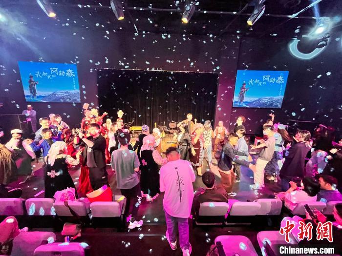 近日,哈薩克族音樂(lè)人米蘭別克演出現(xiàn)場(chǎng),觀眾與音樂(lè)人一起跳起了哈薩克族舞蹈“黑走馬”。中新社記者 勉征 攝