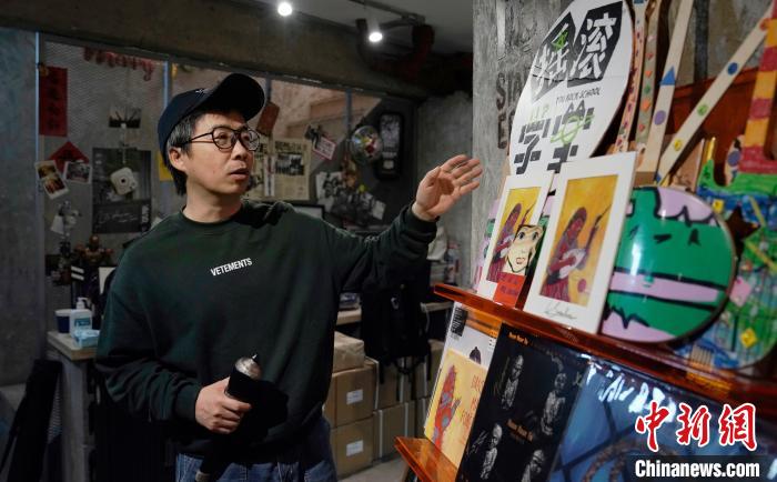 “戰(zhàn)馬時(shí)代”創(chuàng)始人、資深樂(lè)評(píng)人劉釗正在展示為維吾爾族歌唱家塞努拜爾制作的演出周邊紀(jì)念品。景詩(shī)雁 攝
