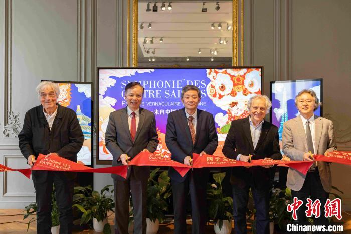 “四季交響——來自中國的鄉(xiāng)土繪畫”展覽于當?shù)貢r間5月30日在巴黎中國文化中心拉開帷幕。圖為嘉賓們?yōu)檎褂[開幕剪彩。巴黎中國文化中心 供圖