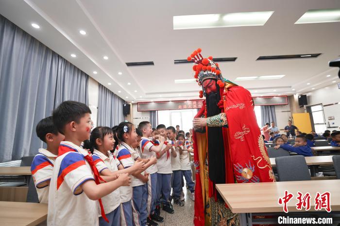 2023年6月26日,山西太原,小學(xué)生們與戲曲人物關(guān)公互動。當(dāng)日,山西省武凌云晉劇名家工作室的藝術(shù)家們走進(jìn)太原新建路小學(xué)校,將傳統(tǒng)戲曲引進(jìn)課堂,讓學(xué)生們感受戲曲的魅力。 中新社記者 張云 攝