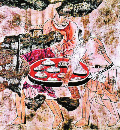 如今的主食豐富多樣,不僅包括面條、餃子、餛飩、米粉等面制品,還有以玉米、小米等雜糧為代表的粗糧制品。其實,宋代已形成中國人主食的雛形,《東京夢華錄》載:“凡餅店,有油餅店,有胡餅店。若油餅店,即賣蒸餅、糖餅、裝合、引盤之類。胡餅店即賣門油、菊花、寬焦、側(cè)厚、油碢、髓餅、新樣滿麻。每案用三五人捍劑卓花入爐?!薄罢麸灐奔创讹灒把b合”即盒裝的餅,“引盤”是盛于盤中的食品,“捍劑卓花”意思是把面團(tuán)先分成大小相近的劑子,再分別搟開成餅,最后捏出花樣。