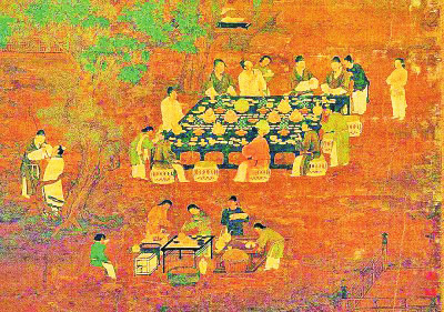 宋代面食既有團(tuán)子狀、面疙瘩狀的,也有薄片狀、條狀的,前者可以用湯匙吃,后者多用筷子吃。此外,《東京夢華錄》中還詳細(xì)介紹了宋代餐廳的外觀、菜肴及客人點菜方法:“每店各有廳院東西廊,稱呼坐次??妥?,則一人執(zhí)箸紙,遍問坐客?!贝笠馐钦f,每家店都有廳堂、庭院、東西廊,待客人落座,店家便送上筷子、紙花,詢問客人要吃些什么。