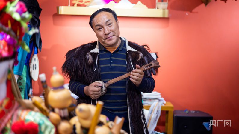 字汝民捧著彝族小三弦(央廣網(wǎng)記者 魏文青 攝)