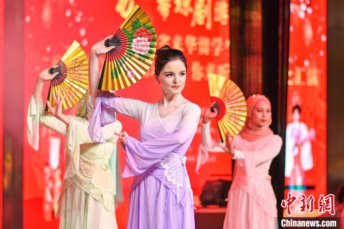 1月22日晚,海南省來(lái)華留學(xué)生“瓊韻華章之瓦唱瓊劇、你來(lái)聽(tīng)”非遺匯演在海口舉行,外國(guó)留學(xué)生表演折扇舞。 肖若洋 攝