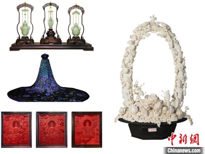 《纏枝蓮紋吊鏈瓶》(玉雕)、《四海升平》(牙雕)、《碧泓云想富貴長天錦繡雀裘》(京繡)和《雕漆剔紅法海寺壁畫》(雕漆)四件作品被認(rèn)定為北京傳統(tǒng)工藝美術(shù)珍品。 主辦方供圖