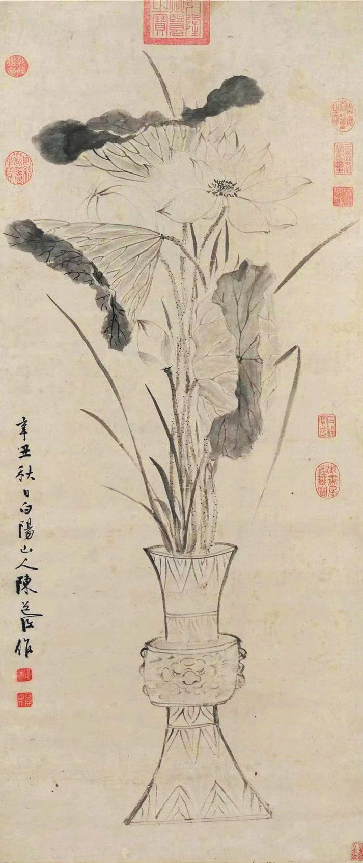 陳淳的《瓶荷寫生圖》中,一青銅花觚內(nèi)插數(shù)枝荷花,細(xì)葉菖蒲點(diǎn)綴其間。向上伸展的枝葉幾乎占滿畫面,盡顯夏日花草的勁挺之氣與蓬勃生機(jī)。此作給人最大的視覺感受是不拘一格的瀟灑筆觸與靈動造型,尤其靠下方的兩片荷葉,以及右側(cè)彎折垂下的一片細(xì)葉,甚至顯現(xiàn)出一絲不加修飾的潦草、頹敗之感,而恰是對此等細(xì)節(jié)的保留,生動體現(xiàn)出植物自然的生長姿態(tài)。