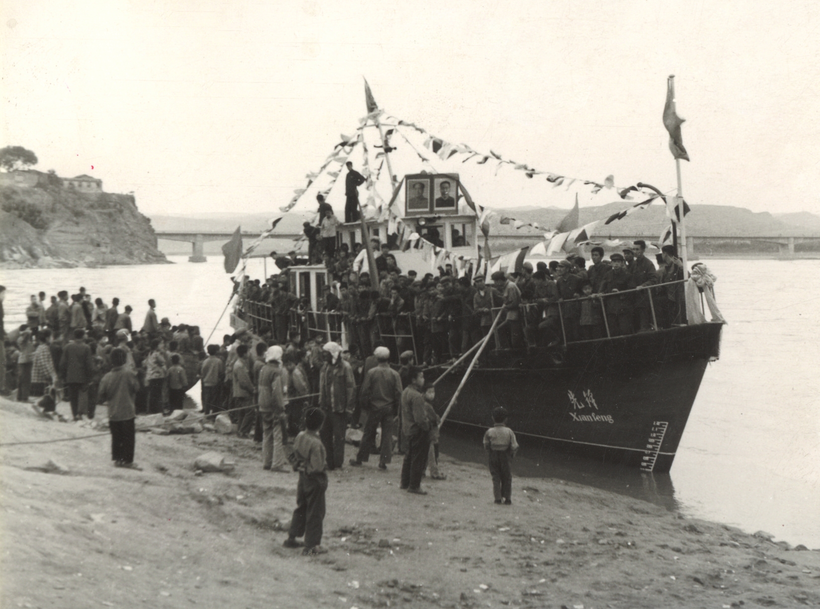 保德縣的木船造得快,取名“先鋒號”,于1977年5月23日,農(nóng)歷四月初六正式下水。這是晉陜峽谷有史以來第一艘機動船,千年未有之新鮮事,少不了要隆重慶賀。有老照片記錄當年盛況:黃河水流浩大,“先鋒號”泊于岸邊,駕駛艙頂上并排矗立著偉人的大幅畫像,上用紅綢花裝飾,船頭船尾紅旗招展,四條彩帶從駕駛艙頂端連向船沿??h領(lǐng)導排坐于船上,禮儀小姐扯著紅綢,河岸上站滿了看熱鬧的群眾。河風吹動大小旗幟,機船顯得威風凜凜。