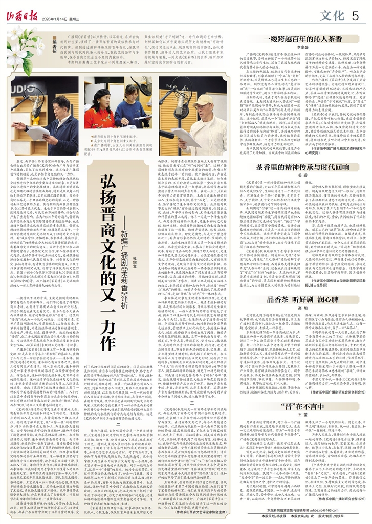 晉商是十五世紀以來中國傳統(tǒng)社會向現(xiàn)代社會轉(zhuǎn)型進程中出現(xiàn)的重要經(jīng)濟文化現(xiàn)象,亦是經(jīng)濟全球化進程中的重要推動力。其連通歐亞的商路也是絲綢之路的重要組成部分,特別是從武夷山到恰克圖的萬里茶道,正是絲綢之路的延續(xù)。因而晉商就不再是一個只具地域色彩的商幫,而是一種推動全球化進程的力量。其行銷的商品雖然種類繁多,但以茶葉最具代表。生長于中國的茶葉在銷入歐洲及美洲之后,對改變世界地緣格局、社會形態(tài)產(chǎn)生了重要影響。在大約500年的時期內(nèi),晉商既是中國社會商業(yè)與國際貿(mào)易的重要組成部分,也是推動中西經(jīng)濟文化相互交流的重要現(xiàn)象。晉商之所以能夠縱橫歐亞九千里,稱雄商界五百年,一個極為重要的原因就是他們形成了獨特的文化與精神。其“誠實守信、開拓進取、和衷共濟、務(wù)實經(jīng)營、經(jīng)世濟民”的精神在今天仍然閃射著耀眼的光芒,有著極為突出的現(xiàn)實意義。習近平總書記在山西考察時曾指出,要堅定文化自信,深入挖掘晉商文化內(nèi)涵,更好弘揚中華優(yōu)秀傳統(tǒng)文化,更好服務(wù)經(jīng)濟社會發(fā)展和人民高品質(zhì)生活。對晉商文化的研究、弘揚與傳承,有著極為重要的現(xiàn)實意義,出現(xiàn)了許多重要的研究成果,創(chuàng)作了許多優(yōu)秀的文藝作品。長篇小說如《白銀谷》《茶道青紅》《茶道通漠北》,電視劇如《大盛魁》《喬家大院》《走西口》,電影如《白銀帝國》等。而廣播劇《茉莉香》正是近期出現(xiàn)的又一部具有鮮明特色的優(yōu)秀之作。