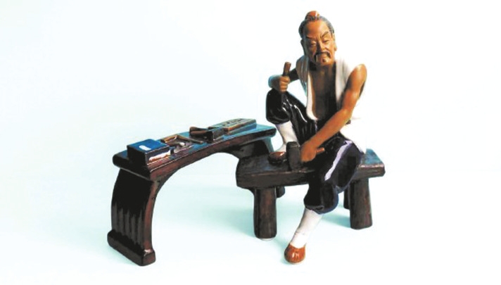 塑像高22厘米、長(zhǎng)14厘米、寬13厘米,魯班右手持鑿、左手緊握鐵錘,雙目炯炯,仿佛正凝神思索,即將開(kāi)啟一場(chǎng)巧奪天工的創(chuàng)作;身旁的工作臺(tái)長(zhǎng)19.7厘米、寬6.5厘米、高10厘米,上面整齊擺放著曲尺、錘子、鑿子等工具。作品靈感源自春秋時(shí)期這位傳奇工匠的故事,以陶塑藝術(shù)為載體,栩栩如生地呈現(xiàn)出魯班的形象,讓歷史底蘊(yùn)與藝術(shù)魅力交融出獨(dú)特的韻味。