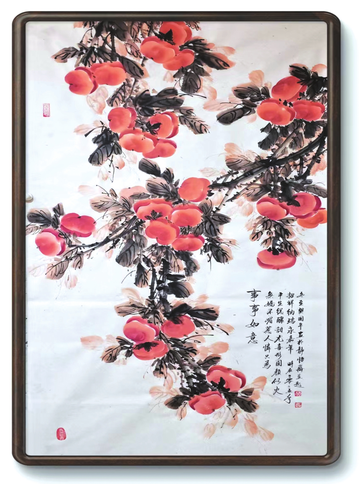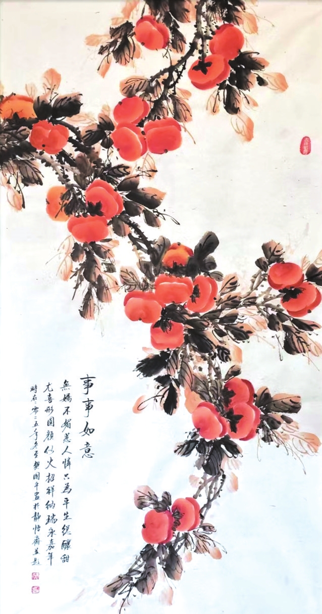 在樊國(guó)平眾多題材探索中,《事事如意》系列柿子圖可謂其藝術(shù)精神與人生哲思的縮影。這些作品超越了尋常花鳥(niǎo)畫(huà)的怡情悅性,成為她寄托情懷、叩問(wèn)生命的重要載體。畫(huà)中那一串串、一簇簇丹柿,色澤溫潤(rùn),形態(tài)豐盈,承載著諧音“事事如意”的吉祥寓意,滿足了社會(huì)對(duì)美滿生活的樸素祈愿。她以此通俗意象為入口,引領(lǐng)觀者步入一個(gè)融匯儒、道、佛哲學(xué)理念的深邃境界,實(shí)踐著中國(guó)藝術(shù)“技進(jìn)乎道”“以畫(huà)載道”的至高追求。